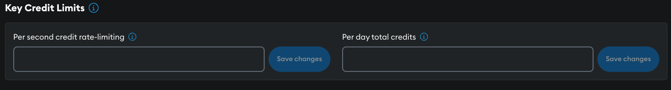 Set credit rate limits to control access to the API key and to limit costs in case of a leaked API key. Set rate limiting in the API key's Settings tab Key Credit Limits section.
